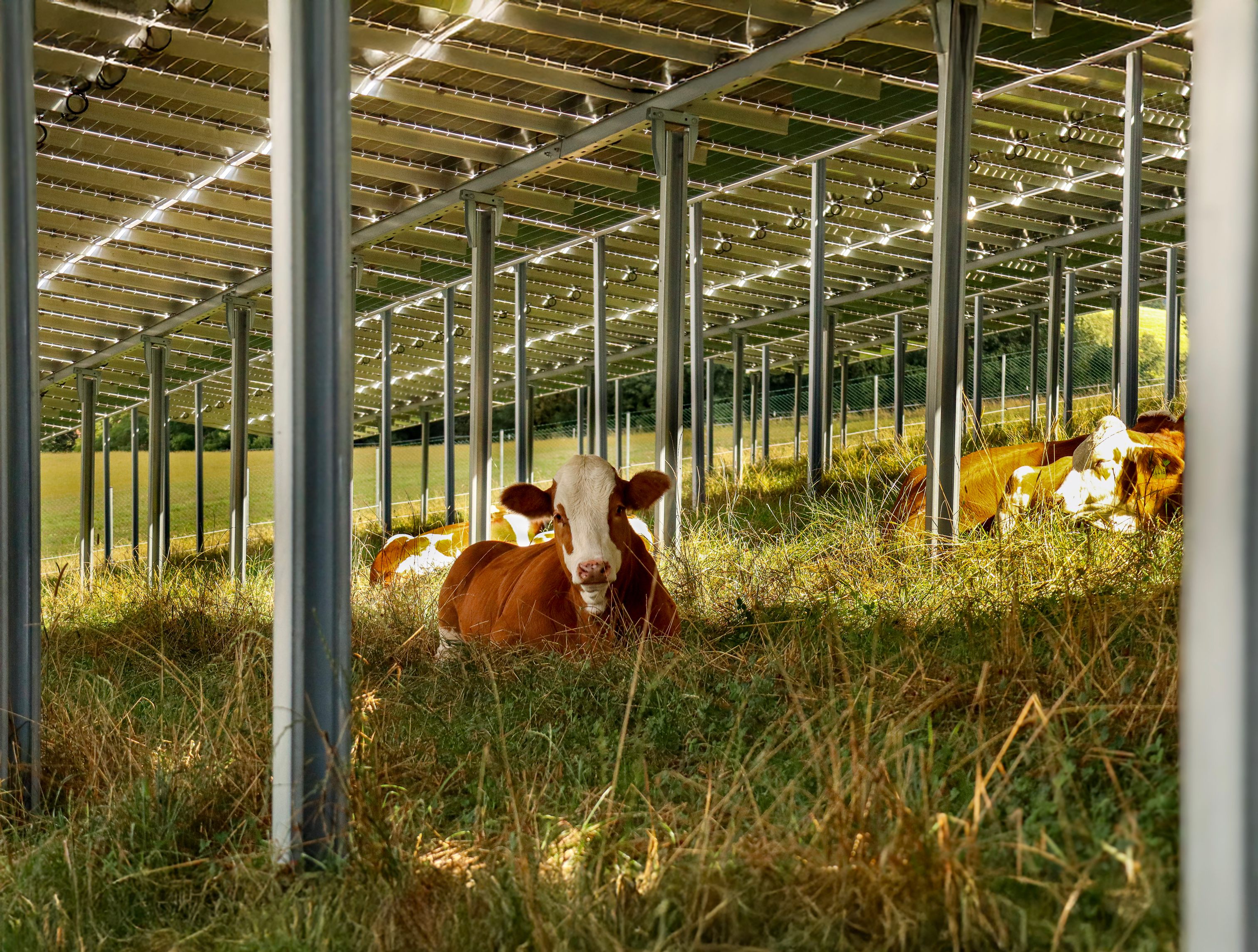Agri-Photovoltaik (Agri-PV) ist eine innovative Lösung, die Landwirtschaft und Energieproduktion auf einer Fläche möglich macht. Die Solarmodule sind so angeordnet, dass Pflanzen und Tiere vor Wetter und starker Sonne geschützt werden, während gleichzeitig nachhaltiger Strom erzeugt wird.